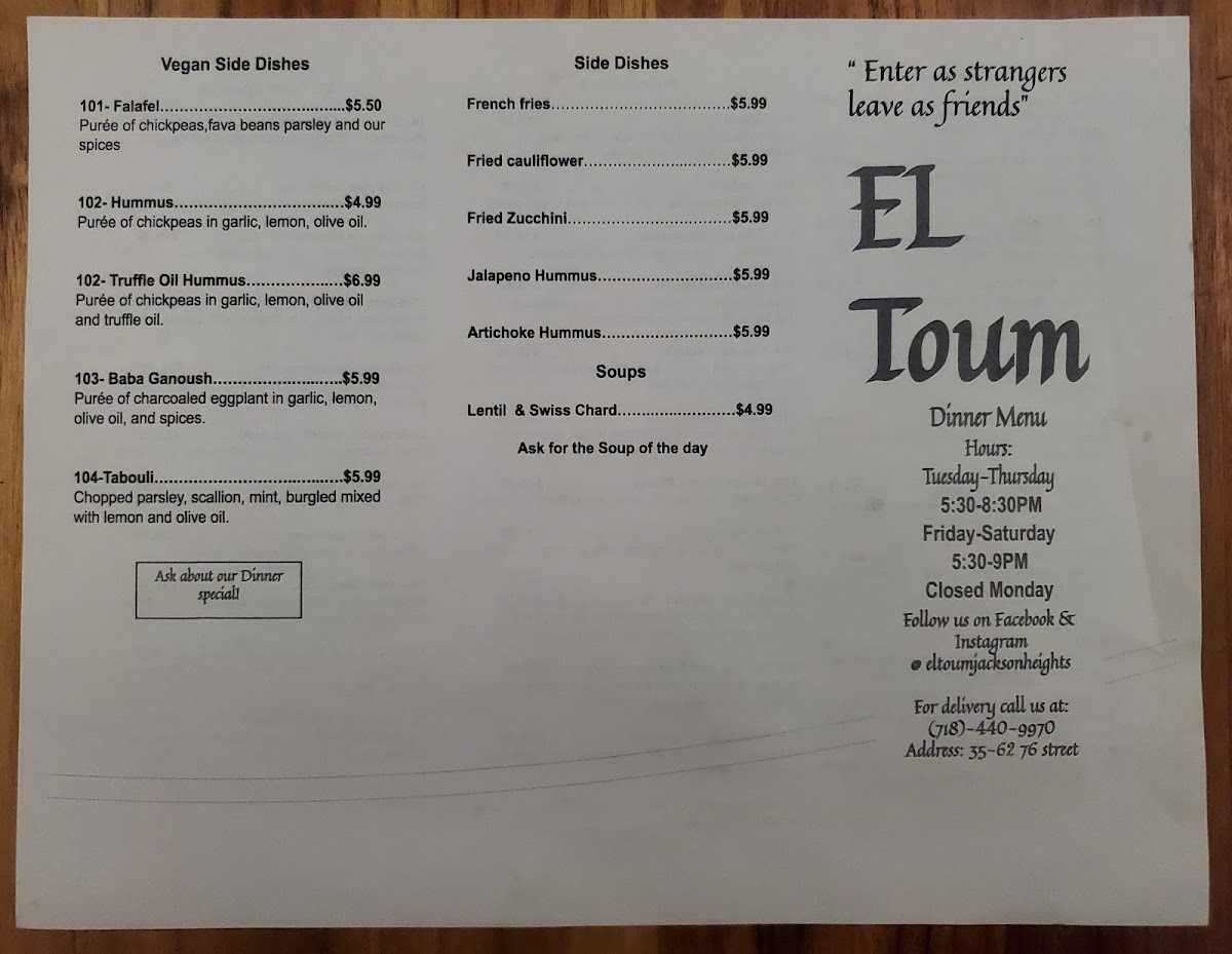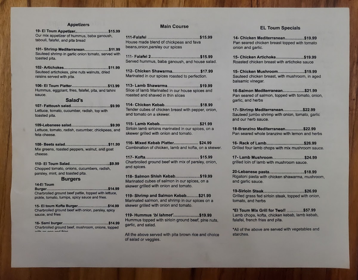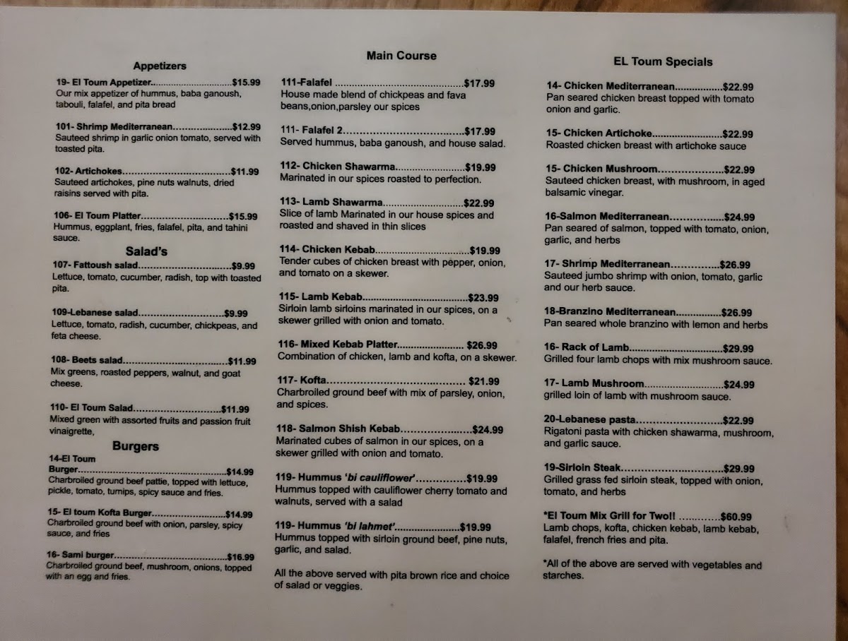 The menu at El Toum offers a thoughtful selection of Middle Eastern dishes that balance tradition with approachable flavors. It’s the kind of menu that invites casual lunches and relaxed dinners alike, featuring comforting plates that are both satisfying and familiar.