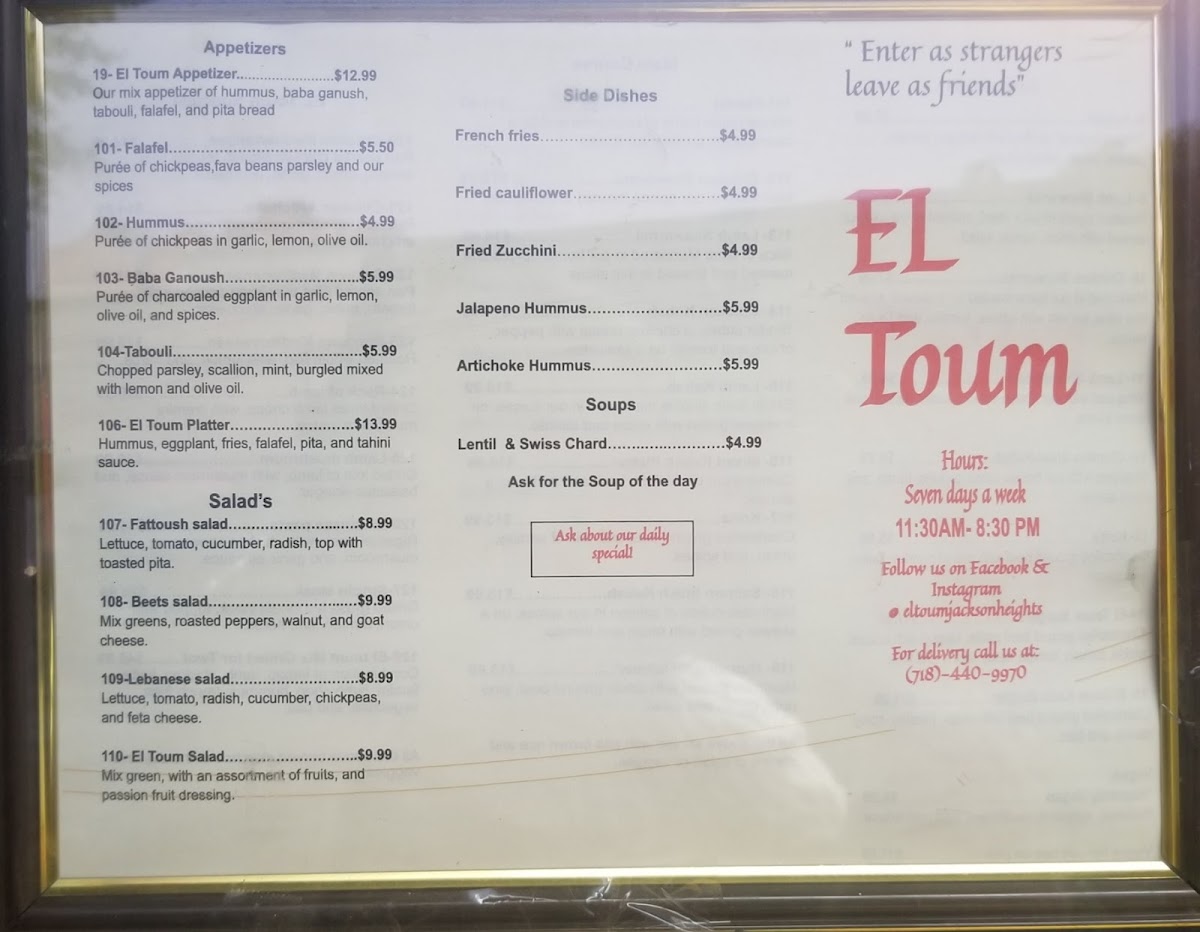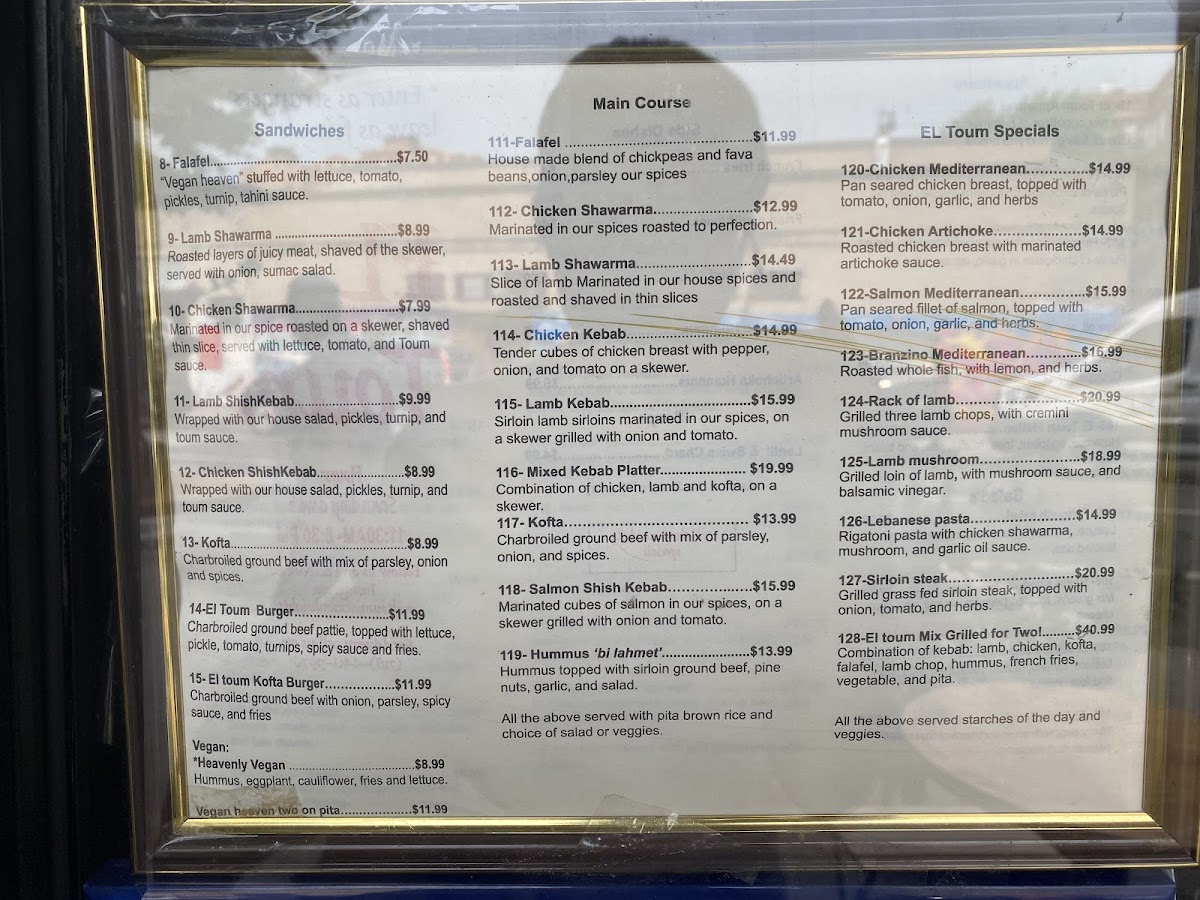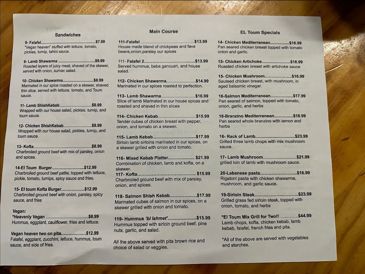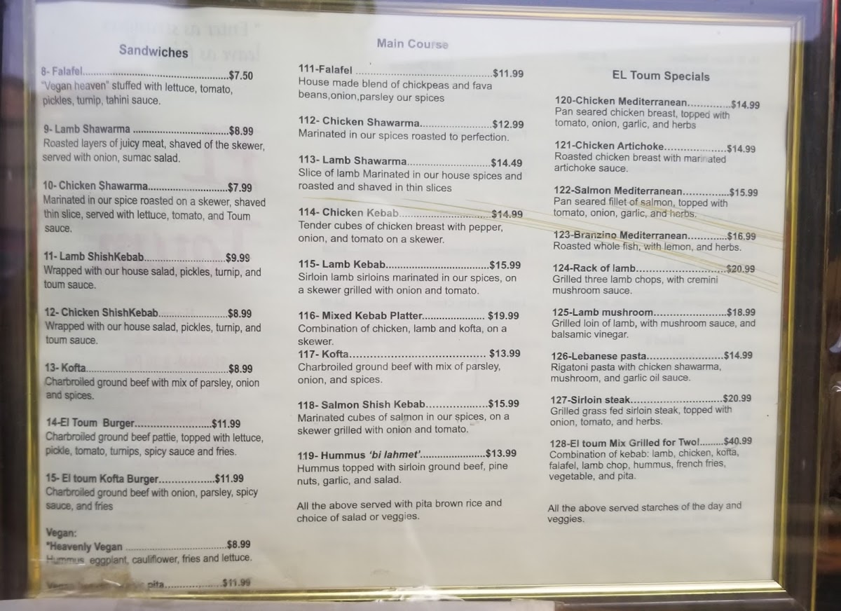 The menu at El Toum offers a thoughtful selection of Middle Eastern dishes that balance tradition with approachable flavors. It’s the kind of menu that invites casual lunches and relaxed dinners alike, featuring comforting plates that are both satisfying and familiar.